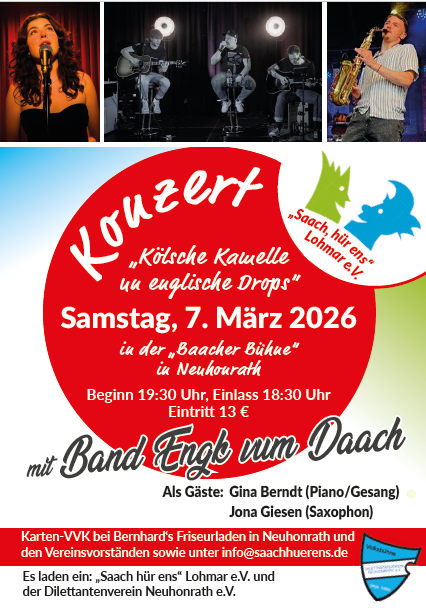 Zu einem Mundart – Konzert der besonderen Art mit der Band „Engk vum Daach“ und Gästen laden der Dilettantenverein Neuhonrath e.V. und „Saach, hür ens“ Lohmar e.V. ein am